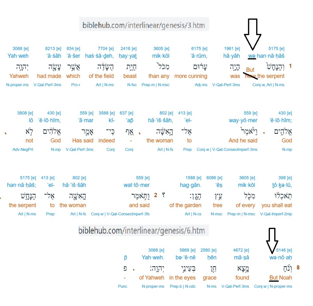 However, a quick comparison of alternative translations shows inconsistent use of this coordinating conjunction across various English translations. What caught my attention is that Genesis 3:1 isn’t in this listing. On examining various versions, I find that while the majority of translations give Genesis 3:1 as Now/And/[T]he serpent was more cunning/crafty/shrewd/subtle than… only a small number of older texts begin with, ‘But the serpent…’ which is how the verse has stuck in my mind. For example10,