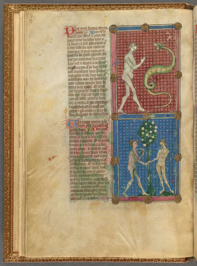 - pic 13 Illuminated manuscript, 1390. https://picryl.com/media/two-miniatures-eve-and-the-serpent-and-adam-and-eve-eating-the-apple-with-text-fc3ae3 https://digitalcollections.nypl.org/