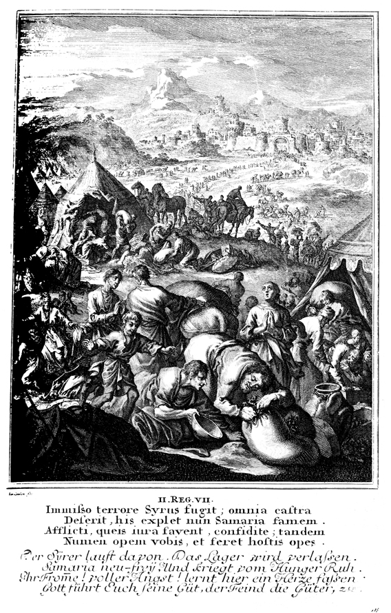 - 5 https://pitts.emory.edu/dia/image_details.cfm?ID=5805 Book Title: Historiae celebriores Veteris Testamenti Iconibus representatae / et ad excitandas bonas meditationes selectis Epigrammatibus exornatae in lucem datae à Christophoro Weigelio Noribergae Author: Luiken, Caspar, 1672-1708. Image Title: The Siege of Samaria Is Lifted