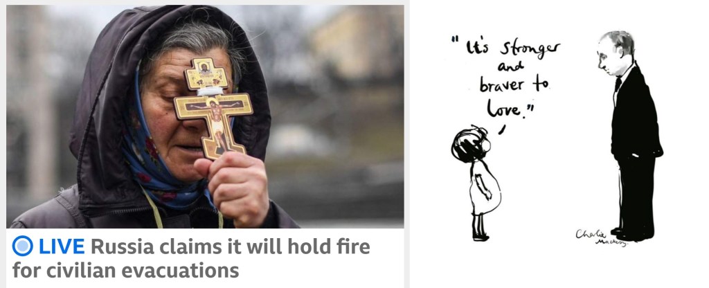 Each week we have a political interview programme on the BBC called ‘Question Time,’ where Archbishop Justin Welby joined the panel to respond to questions put by a selected but balanced audience. When asked about bringing justice to Putin and the Russian invaders, he quickly sidestepped any talk of the Final Judgement. ‘You would expect me to mention that,’ he said. But what matters is justice now, the cessation of violence now, and yes, there can then be justice done on earth, through war crimes trials and suchlike. This drew the sting of the critic who went on to pour scorn on the idea of Putin ‘facing his god.’ You may have read of the disastrous alignment of significant parts of the Christian church in Russia with Putin’s project, and of Patriarch Kirill’s explicit support. This was anticipated in Ukraine, where the Orthodox very properly broke relationship in 2019, which was acknowledged to pose a threat to Russia. Such churches and their leaders have also been in the firing line.