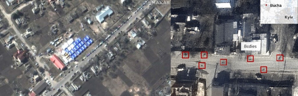 As of the 4th April, for us in the UK the horrors of this unjust war have been transformed from imagined to very literal. Metaphorical stamping of iron feet has given way to actual video footage of BBC correspondents walking down a couple of village streets packed with the debris of war. Depending on where and when you source your viewing, the corpses lying as the folk fell in the road may or may not be pixelated out on your screen, as you hear journalist Jeremy Bowen giving his mostly dispassionate account of murders and rapes. At the moment, these are numbered in the tens and twenties- horrific, but still on a scale that we might grasp.