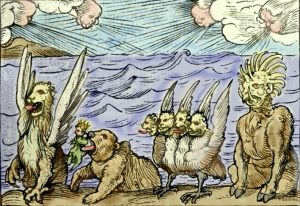 Should we detect several deliberate allusions to the Genesis narrative in this account? I think so: there are winds moving over waters, and a series of strange creations emerging from the deep. There is speaking of command and with power, though by whom? However, the creatures emerge from the water, not the land, and they are each one of a strange kind, not two by two, and thankfully unable to breed. They are, rather, described as being neither this nor that– both mammal and bird in chimeric form, asymmetric, part formed, and not quite complete, eating flesh rather than fruit or seed. The second monster is already eating its fill before the command to eat flesh has been given. Compared with Genesis 1, everything is out of order, chaotic and confused. The first beast is subject to some supernatural operation, as before our gaze certain parts are removed and then a further transmogrification takes place. Into a man! In Genesis, the Human is the final glorious creation, but here, in some crude pre-Frankenstein surgery, the first beast is immediately contorted while very much awake into the shape of enash (In the Aramaic section of Daniel: man, mankind, directly equivalent to the Hebrew ha’adam), a man; and as this animal-human lifeform is completed, a mind is given to it, the mind of a man. Our current world of science and rationality rightly asks, ‘What is it to be human?’ The answers often settle around a list of measurable characteristics: upright stance and two-footed gait freeing the hands, lack of body hair, opposable thumbs, a significant capacity for language, and a cranial capacity making possible an intellect and sociability far beyond the scope of other primates, singing whales or the few birds that use tools. Well, perhaps that is the human man that is described here in Daniel 7:4. But it is not quite the same ha’adam of Genesis 1 and 2, moulded by God’s own fingers and thumbs from the red clay earth, life breathed in by God’s own pneuma. This enash is a fake image-idol, a counterfeit. There is no partner for this man or any other of the beasts. Do I discern a dark emphasis of this point in the second beast? The bear-like creature has ribs in its mouth as it is elevated from the waters- the part of ha’adam that God took once asleep in gentle surgery to transform into the woman- now the ribs are only evidence of a crudely consumed meal. What does ‘raised up on one side’ mean? Holbein draws a deformed hump on the back of his bear, but I think that something very much more wonky is intended. In Genesis, there are neat spaces of creation in days 1-3, which are tidily filled in days 4-6. As creation proceeds, there is an organised separation of spaces and things, which are then populated and completed as everything is drawn together into a beautifully pleasing whole; habitats and organisms, ecosystems and biosphere, in the parlance of biologists. In Daniel 7, all this ordering from chaos is disturbed, and so are we, as we read this vision which severely tests Daniel’s credulity. Even as he dreams, we sense him rubbing his eyes in disbelief and growing disquiet. There are no proper names for what he sees, and nothing here is ‘very good.’