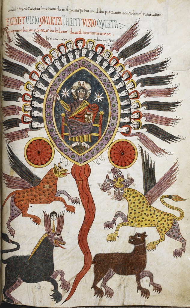 What a glorious vision! I wonder if you agree that too much attention has been given to speculations on the beastly creatures of Daniel 7, at the expense of our focus on this insight into spiritual realities. While using archaic modes of artistic expression, for me, the illuminated manuscript known as Silo’s Apocalypse gets it exactly right. The four beasts are given a rather naïve treatment, more like lap dogs than dread monsters of nightmares. Three are more grinning than growling, but all are equally transfixed by what they can see is important- the heavenly court arrayed in ordered majesty above them. All the creatures’ eyes, including the pair belonging to the final horn, are giving complete attention to the final seat of accountability, the Ancient of Days, enthroned and glorious, surrounded with the splendour of angels.