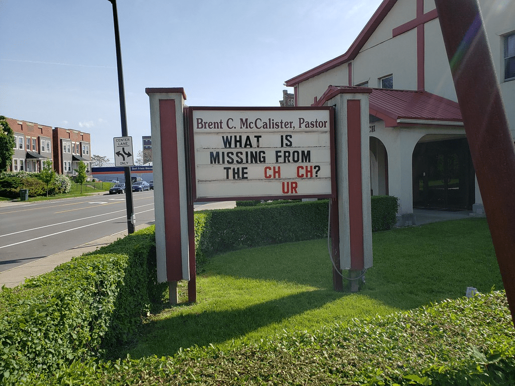 Seriously though, the hand actions and rhyme at least make the point that the church and the people go together. Inextricably. No people- no church! As it says on this church billboard…