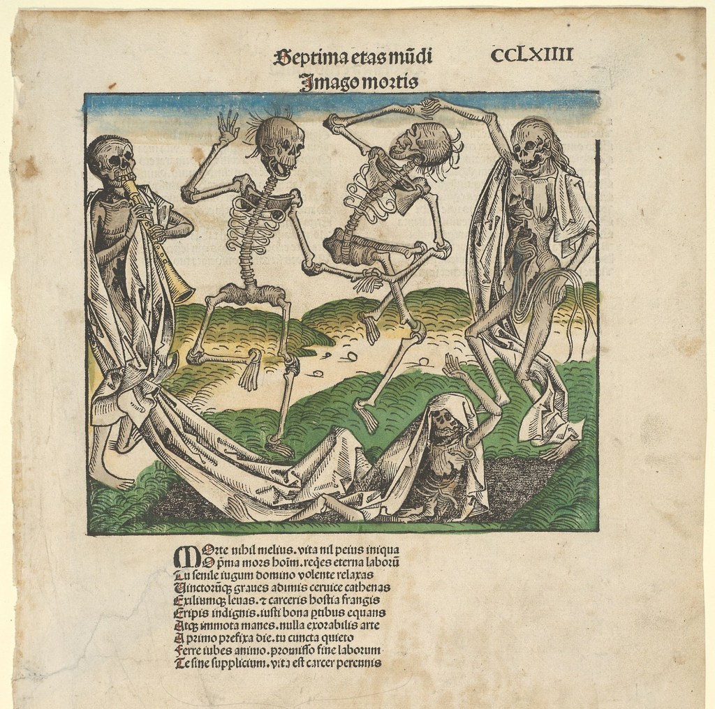 6 text-history-miniature-1461523-pxhere.com Image of Death (Imago Mortis), from the Nuremberg Chronicle. This brightly coloured leaf from The Nuremberg Chronicle shows five cheerful skeletons and decaying cadavers dancing, playing music, and emerging from a grave. One tosses its bluish entrails about like a dress train, while others rattle dry bones. Fingerprints appear on the right side of this evidently well-thumbed page. A user also bracketed the text below that begins, “Nothing is better than death,” underscoring the importance of the memento mori (Remember you must die) message offered by the work. The Nuremberg Chronicle was also available uncoloured, in black and white; an example is displayed in its entirety nearby.